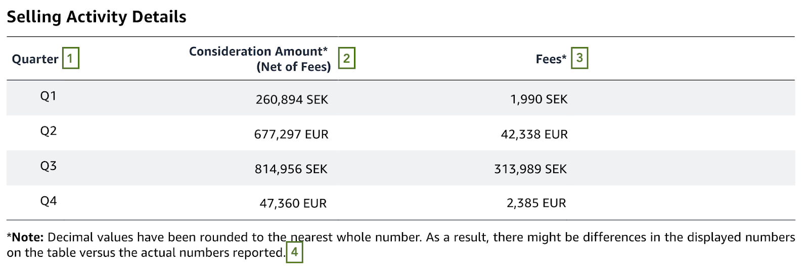 - Consideration Amount* (Net of Fees) Vergoedingsbedrag* (na aftrek van kosten): dit zijn de bedragen die op je bankrekening zijn gestort